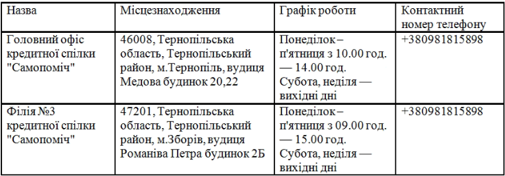 1. За місцезнаходженнням кредитної спілки «Самопоміч»: 46008, Тернопільська область, місто Тернопіль, вулиця Медова, будинок 20,22